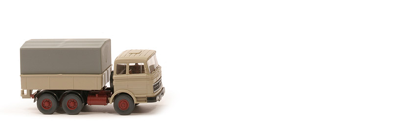 Kabine Typ: Dach querversteift, Kabine: gelbgrau, Spiegel: mit, Scheibenwischer: mit, Verglasung: klar, Inneneinrichtung: ca. lehmbraun, mit Lenkrad, Grill: schwarz, Zierlinien und Stern gesilbert, Stoßstange: schwarz, Chassis: ca. braunrot, Halterung Pritsche: mit, Radlauf hinten: zweiteilig schwarz, Reserverad: hinter Kabine, Sattelpfanne: