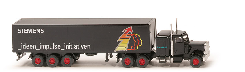 silbern, für großen Königsbolzen , Bedruckung Schlafkabine: "Siemens" in grün, Reserverad: ohne, Auflieger Typ: Koffer, Chassis gesteckt, Farbe: schwarz, Türen: nicht zu öffnen, schwarz, Beschriftung Seiten: "Siemens, ideen, impulse ...", weitere Beschriftung: ohne, Beschriftung Art: Druck weiß, gelb, orange, rot, Chassis: schwarz, mit Unterfahrschutz, Chassis Bodenprägung: neues WIKING-Logo, Germany, Dreiachsaggregat Typ: gesteckt, Kotflügel eckig, Dreiachsaggregat Farbe: schwarz, Reserverad: unter Chassis gesteckt, Stütze: Rollen, schwarz, Räder Typ: 12 mm, 2-teilig, Felgen eingesetzt, Felgen: 8-Loch rot, 1996