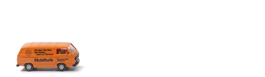 Farbe Karosserie: hellgelborange, Grill und Lüftergitter: schwarz eingesetzt, Verglasung: klar, Inneneinrichtung: Sitze nur eine Reihe, Lkr integriert, Farbe Inneneinrichtung: ca. hellgelbgrau, Chassis Farbe: schwarz, Bodenprägung: Wiking Berlin-W, Beschriftung Seiten: "Mobiltfunk "... (s. Foto), Beschriftung Heck: "Siemens", Beschriftung Art: Druck schwarz, Bemalung Scheinwerfer: ohne, Bemalung hinten: ohne, Räder: Riffelkappe, Felgen: gesilbert, 1986