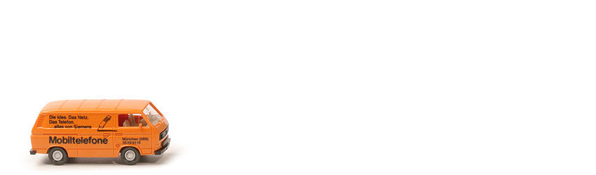 Farbe Karosserie: hellgelborange, Grill und Lüftergitter: schwarz eingesetzt, Verglasung: klar, Inneneinrichtung: Sitze nur eine Reihe, Lkr integriert, Farbe Inneneinrichtung: ca. hellgelbgrau, Chassis Farbe: schwarz, Bodenprägung: Wiking Berlin-W, Beschriftung Seiten: "Mobiltelefone "... (s. Foto), Beschriftung Heck: "Siemens", Beschriftung Art: Druck schwarz, Bemalung Scheinwerfer: ohne, Bemalung hinten: ohne, Räder: Riffelkappe, Felgen: gesilbert, Links Serienmodell "Mobiltelefone":
