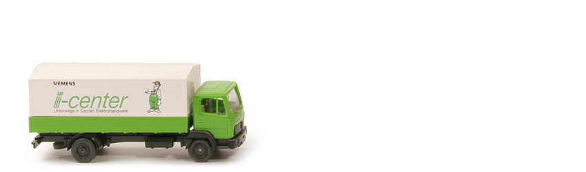 Kabine: gelbgrün, Fensterstrebe: Teil des Verglasung, Grill: schwarz, eingesetzt, Grillbedruckung: ohne, Inneneinrichtung : graubeige, Lkr integriert, Kotflügel, Stoßstange: schwarz, Chassis: schwarz, Kotflügel hinten: schwarz, Bodenprägung: WIKING, Berlin-W, Reserverad: unter Chassis, Pritsche: gelbgrün, Pritscheneinlage: Pappe, silbern, Plane: weiß, Beschriftung Plane Seiten: "Siemens, i-center", Handwerker, Beschriftung Plane hinten: "Siemens, i-center", Beschriftung : ohne, Räder: 10 mm, 1992