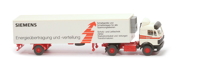 Zugmaschine Fahrerhaus: weiß, Inneneinrichtung: lichtgrau mit separat eingesetztem Lenkrad, Scheibenwischer: plastisch, Grill: umlaufend, schwarz, Stern silbern bedruckt, Kotflügel vorne, Stoßstange: schwarz, Scheinwerfer: silbern eingesetzt, Ansaugstutzen: schwarz, hinter Kabinenrückwand, Chassis: orangerot, offen, Chassis Bodenprägung: WIKING - neues Logo, Radlauf hinten: schwarz, mit integrierter Sattelpfanne, Reserverad: unter Chassis, Räder: 12 mm, Profil grob, Felgen: 8-Loch, orangerot, Auflieger Koffer Korpus: weiß, Dach: weiß, Türen: weiß, nicht zu öffnen, Beschriftung: Siemens ... (s. Foto), Beschriftung Art: Druck, Chassis: orangerot, Bodenprägung: WIKING Berlin-W, Unterfahrschutz: mit, Achsaggregat Farbe: orangerot, Achsaggregat Typ: eingesteckt, Klipsachsen, Hydraulikstütze: orangerot, Rollen, Räder: 12 mm, Profil grob, Felgen: 8-Loch, hellbraunrot, 1992