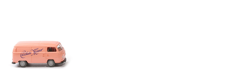 Karosserie: rosa, Türgriffe: erhaben, Verglasung: klar, Lenkrad: schwarz, Inneneinrichtung: schwarz, Bemalung Scheinwerfer: silbern, Bemalung Rückleuchten: ohne, Beschriftung: "Chocolade Manner", ... (s. Foto), Beschriftung Art: Druck dunkelblau, Chassisfarbe: schwarz, Bodenprägung: Wiking Germany (neues Logo), Räder Typ: 8 mm, Nabe gewölbt, silbern, 2004