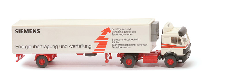 Zugmaschine Fahrerhaus: weiß, Inneneinrichtung: lichtgrau mit separat eingesetztem Lenkrad, Scheibenwischer: plastisch, Grill: umlaufend, schwarz, Stern silbern bedruckt, Kotflügel vorne, Stoßstange: schwarz, Scheinwerfer: silbern eingesetzt, Ansaugstutzen: schwarz, hinter Kabinenrückwand, Chassis: orangerot, offen, Chassis Bodenprägung: WIKING - neues Logo, Radlauf hinten: schwarz, mit integrierter Sattelpfanne, Reserverad: unter Chassis, Räder: 12 mm, Profil grob, Felgen: 8-Loch, orangerot, Auflieger Koffer Korpus: weiß, Dach: weiß, Türen: weiß, nicht zu öffnen, Beschriftung: Siemens ... (s. Foto), Beschriftung Art: Druck, Chassis: orangerot, Bodenprägung: WIKING Berlin-W, Unterfahrschutz: mit, Achsaggregat Farbe: orangerot, Achsaggregat Typ: eingesteckt, Klipsachsen, Hydraulikstütze: orangerot, Rollen, Räder: 12 mm, Profil grob, Felgen: 8-Loch, hellbraunrot, 1992