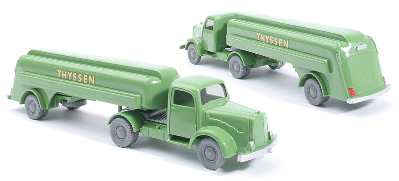 Beim Werbemodell THYSSEN handelt es sich um das Modell des kleinen Tanksattelzuges mit der MB L 5000 S Zugmaschine. Es ist baugleich mit dem frühen ARAL-Modell. Lediglich die Farbe und die Beschriftung variiert - und zum Modell gehört die klare Stulpschachtel und die Werbeeinlage.