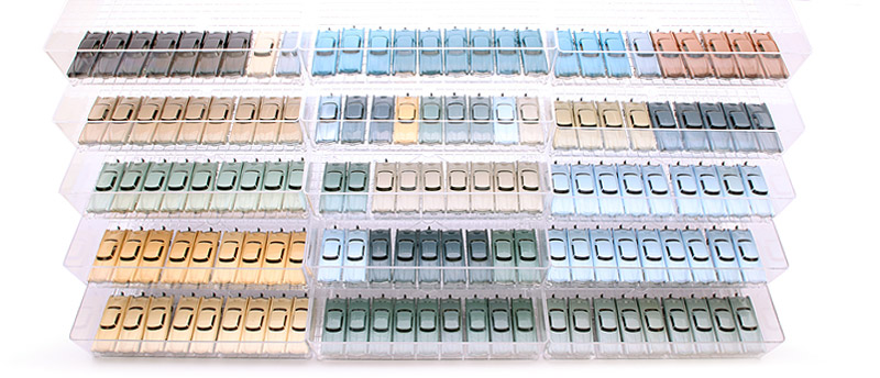 vordere Reihe: A) creme, B) hellbeige, C) weißblau, D) ozeanblau, E) azurblau, F) hellgraublau