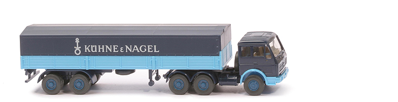 ![]() oben Version 2.2. - neue Pritschenversion mit Haltenasen. Hier mit angestecktem Auflieger-Chassis Ab 1978 gab es mit gleichem Pritschenauflieger den Kühne & Nagel MB 2632. Bemerkenswert hier ist die erstmals auftauchende Plane. Es folgten noch einige weitere Verwendungen - insbesondere auch mit MAN-Kippkabine.