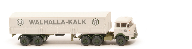 Version 2 - "Flachpritsche" (Bezeichnung Messe-Info 1967) - ab 1967Version 2.1. - Flachpritsche mit geklebtem Chassis - ab 1967Im Jahre 1967 wurde der Magirus Sattelzug mit Ladung vorgestellt. Damit debütierte die Pritsche mit der niedrigen vorderen Pritschenwand, die gering verändert aktuell bei der Modellpflege Oktober 2016 beim "Walhalla Kalk" verbaut wurde. In der Anfangszeit gab es für diese Pritsche keine Plane, da der Röhren-Sattelzug offen fuhr.