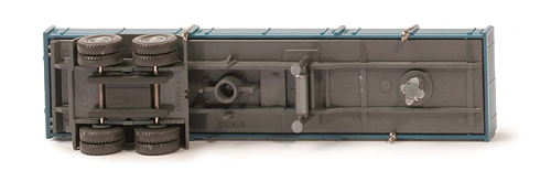Von der Unterseite betrachtet fallen hier wie bei der späten Flachpritsche die beiden Haltenasen auf. Hier wurde das Chassis und das Doppelachsaggregat eingeklipst. Anders jedoch als bei der oben erwähnten Chassisversion ist hier nun der Unterfahrschutz entfallen, da das Chassis nunmehr klassischen Modellen vorbehalten bleiben sollte. Bodenprägung des Chassis: WIKING, Germany.